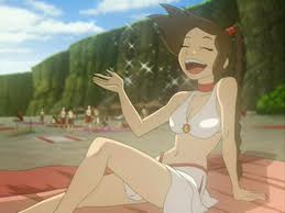 Toph is the strongest, best earthbender in the world, and the least girly girl in the entire show, but she thinks it’s fine to be that way because she’s blind and doesn’t care for physical appearances. One of the best things about Toph is that appearances mean so little to her: she develops this crush on Sokka because he’s hilariously funny, not because he’s cute. Toph doesn’t care about her appearance or even very much about her hygiene – she works with earth all day and is often covered in dust. When she and Katara take a girly day in the Tales of Ba Sing Se, she confesses to Katara that it’s nice to be girly for a change but it’s not who she really is. As some spoiled rich bimbos walk by and taunt her for looking ridiculous, Toph does what she does best – her earthbending. She knocks the girls into the river and Katara washes them away.