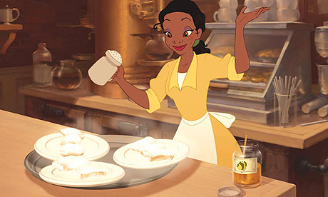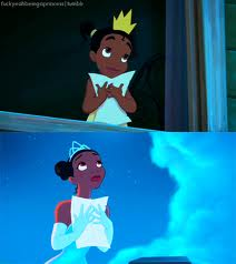 Tiana doesn’t believe in wishing. She believes in hard work. Her best friend, Charlotte, is a spoiled, shallow (but totally funny!) debutante and Tiana contrasts her so sharply sometimes I almost cut myself watching. See what I did there? Oh, Charlotte’s not all that bad. Tiana’s a good friend of hers. But Tiana still has to work twice as hard and twice as long as any of her friends to achieve her dream when Charlotte could simply throw the cost of one dress at her to help her open up her restaurant. Tiana works hard, and she’s proud of that fact. She tells Naveen, “I’ve had to work hard for everything I’ve got,” which really resounds with me, and I think it leaves a great message to its target audience. No more Domestic Goddess princesses. No more princesses who do nothing but wait for someone to rescue them. Tiana is on her way to getting what she wants, and she’s only 19. Even Belle (mon amie!) wanted something (adventure) but wouldn’t actively go seeking it of her own free will. Even Ariel (poor unfortunate soul) didn’t seek out Ursula until Flotsam and Jetsam suggested it. Tiana is on par with Jasmine, Mulan and Pocahontas who all sought their own path without outside influence and who, incidentally, are all non-Caucasian. Perhaps that’s because the non-Caucasian princesses are the most recent films, but maybe I’m sensing a theme here!