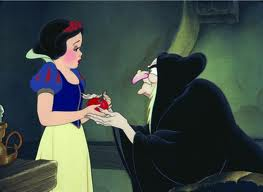 The queen finds out Snow White is still alive when her truth-mirror tells her exactly where she is. To disguise herself, she changes her appearance and her voice into that of an ugly old crone. I hope she planned on turning herself back. I can’t even say anything like Disney is presenting ugly people as evil because the Queen was originally very beautiful on the outside, just consumed with envy and jealousy at Snow White’s beauty and innocence. Perhaps that’s what made Snow White so beautiful: she was pure inside and out, and the Queen was all twisted up in her own vanity.